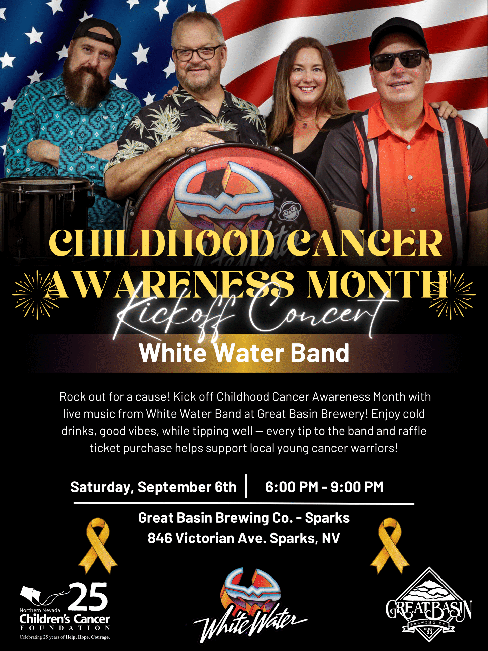 Rock out for a cause! Kick off Childhood Cancer Awareness Month with live music from White Water Band at Great Basin Brewery! Enjoy cold drinks, good vibes, while tipping well — every tip to the band and raffle ticket purchase helps support local young cancer warriors!