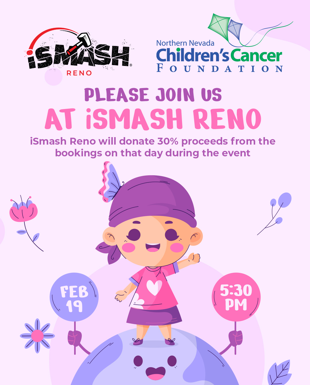 Smash out cancer at iSmash Reno on Thursday, February 19th, from 5:30 PM to closing! iSmash Reno will donate 30% of all appointment proceeds during this period to NNCCF. Sign up for their smash room, splatter paint room, and/or axe-throwing experience now!